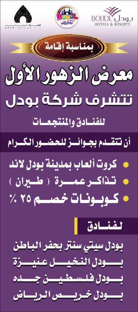 إخبارية حفرالباطن V Twitter بمناسبة معرض الزهور بحفرالباطن بودل للفنادق والمنتجعات تذاكر عمره طيران كوبونات خصم ٢٥ مدينة بودل لاند الترفيهية حفرالباطن حفرالباطن عنيزه جدة الرياص Https T Co Vpfww4vgy8