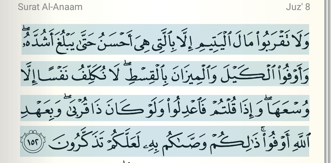و ل ا ت ق ر ب وا م ال ال ي ت يم إ ل ا ب ال ت ي ه ي أ ح س ن ح ت ى ي ب ل غ أ ش د ه و أ و ف وا ال ك ي ل و ال م يز ان ب ال ق س ط ل ا ن ك ل ف ن ف س ا إ ل ا و س ع ه ا و إ ذ ا ق ل ت م ف اع د ل وا و ل و ك ان ذ ا ق ر ب ى و ب ع ه د الل ه