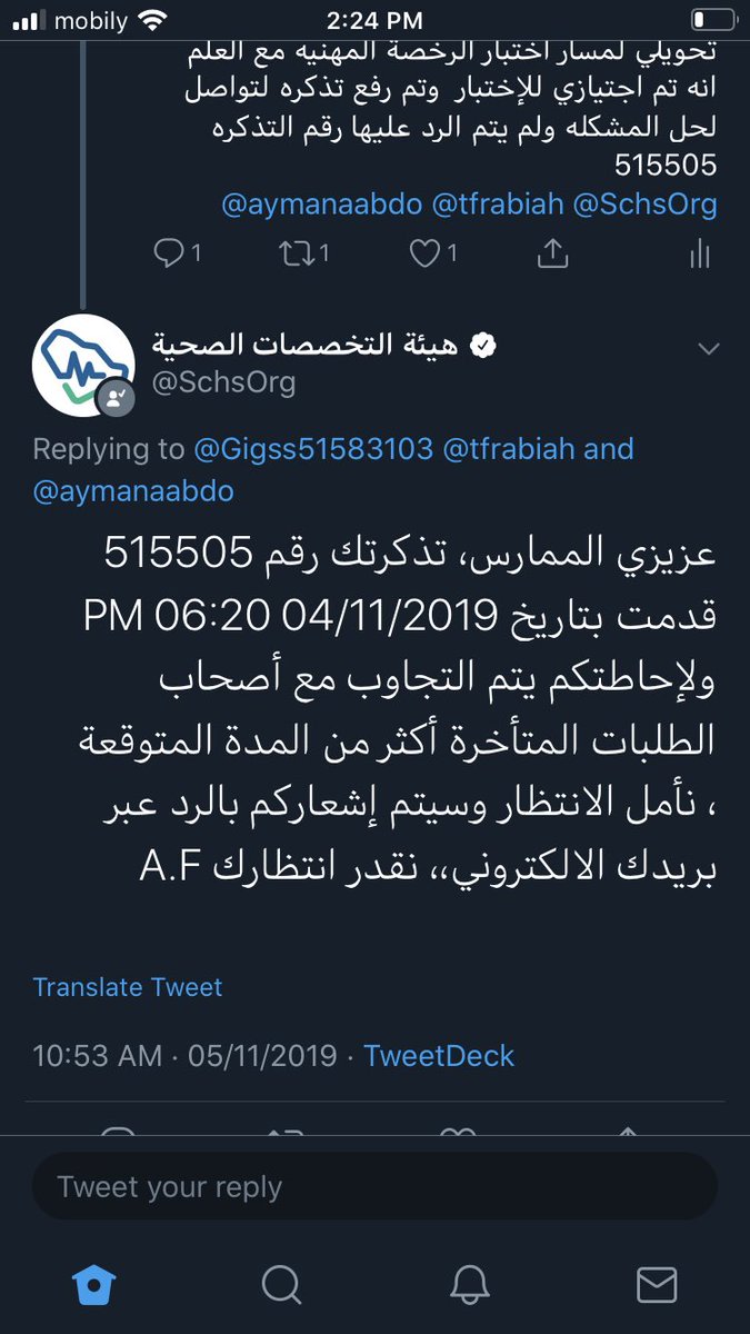 هيئة التخصصات الصحية On Twitter عزيزي الممارس تذكرتك رقم 515505 قدمت بتاريخ 04 11 2019 06 20 Pm ولإحاطتكم يتم التجاوب مع أصحاب الطلبات المتأخرة أكثر من المدة المتوقعة نأمل الانتظار وسيتم إشعاركم بالرد
